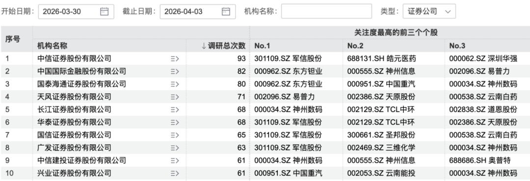 3月30日以来,中信证券调研总次数最多,为93次。从证券公司调研情况看,军信股份等个股受青睐。