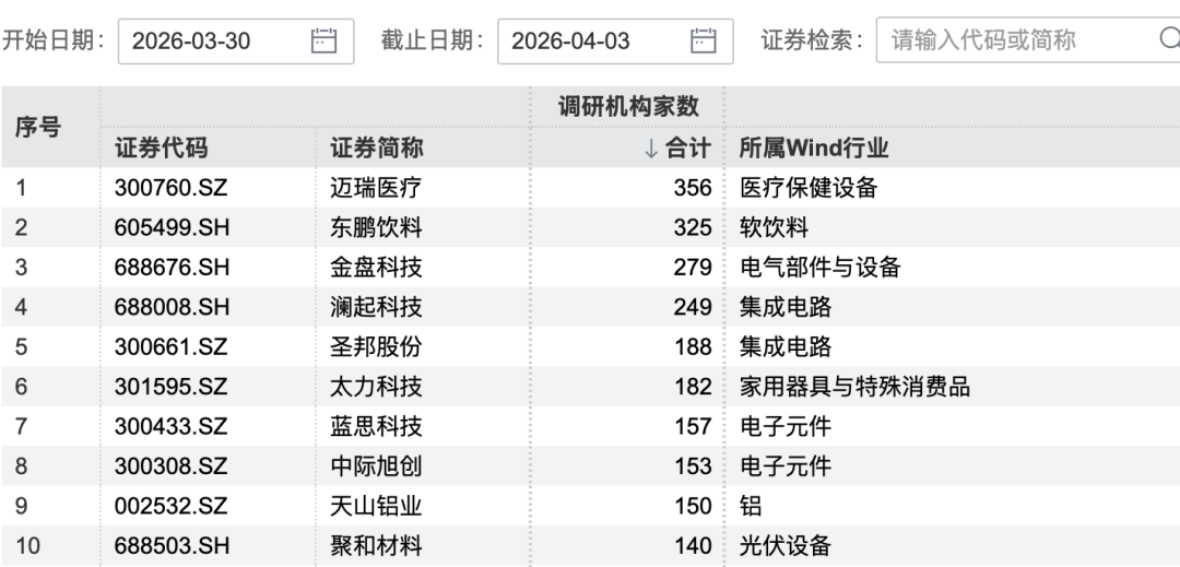 3月30日至4月3日调研总次数排名前十情况图片来源:Wind