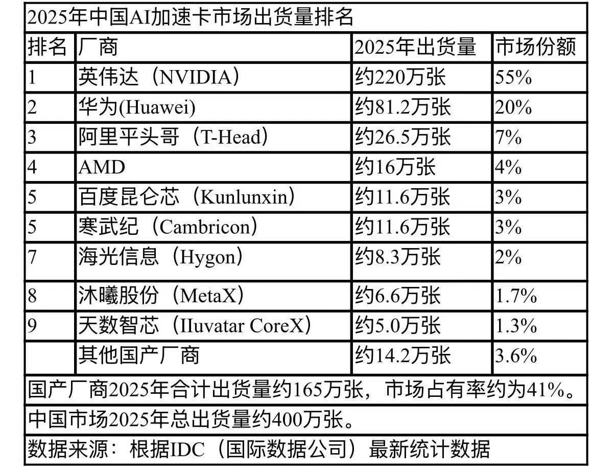 《中国经营报》记者注意到,在英伟达GPU(尤其是高端型号)受限的情况下,中国市场已经有了一张可用的国产算力清单。根据市场研究机构IDC最新研报,中国本土的GPU和AI芯片厂商2025年向本土的AI服务器市场交付了165万张AI加速卡,在总出货量400万张的2025年中国云端AI加速器市场占有超过41%(一般情况下一张AI加速卡上会配备一颗AI芯片)的份额;而基于英伟达GPU的AI加速卡2025年在中国市场的出货量预计为220万张,市场份额大约为55%,已经近乎腰斩。