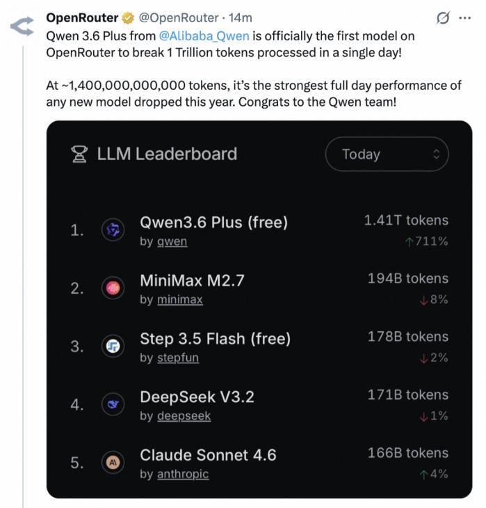 图说:OpenRouter社媒官宣截图,称Qwen3.6-Plus破纪录,是“最强劲的新模型表现”