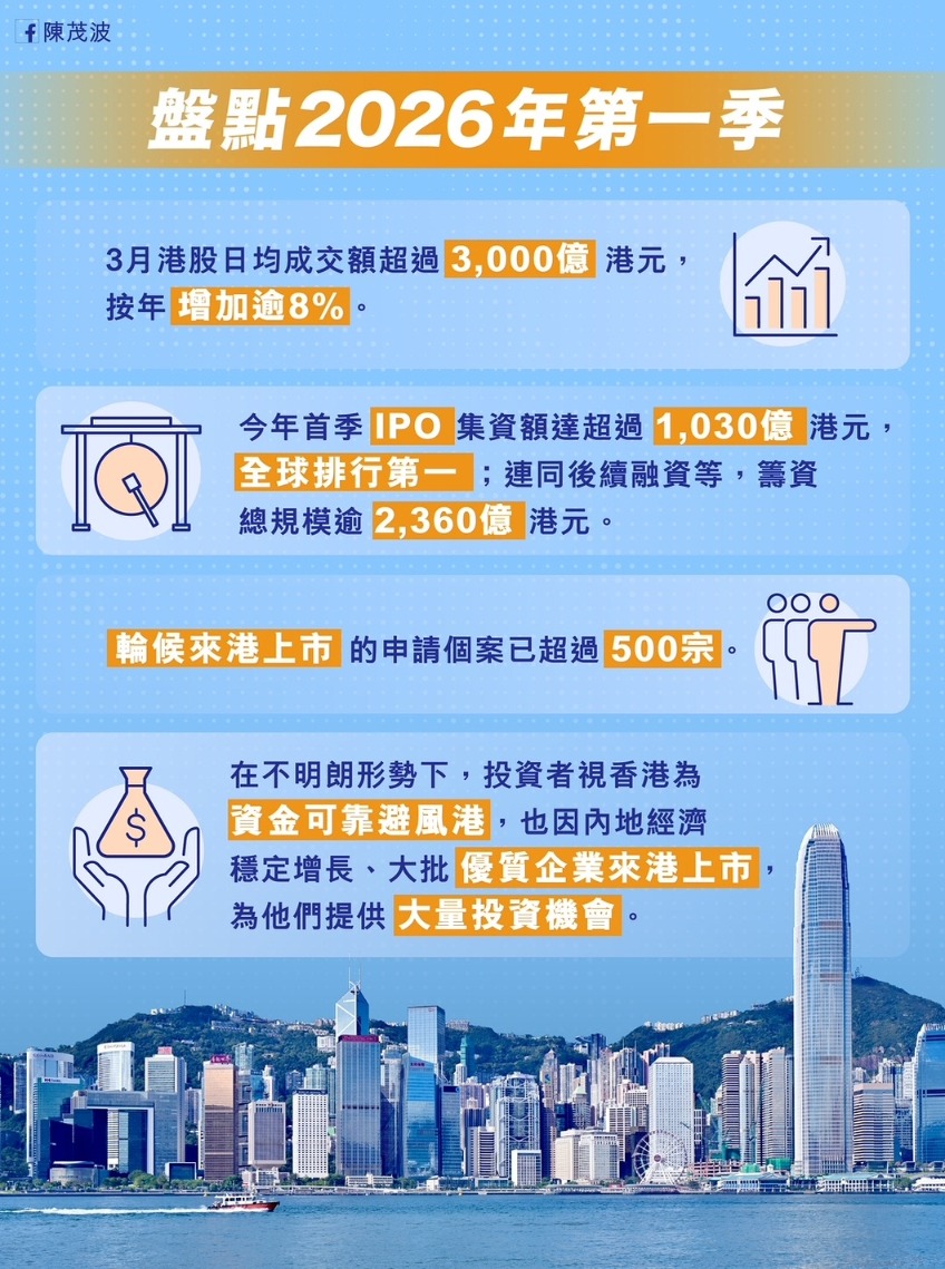 陈茂波表示,全球局势仍然复杂多变,中东地区冲突的阴霾持续困扰市场情绪。受外部因素拖累,香港股市出现回调,恒生指数今年来下跌约2%,但交易活跃,首两月日均成交额超过2,600亿港元,按年升17%。踏入3月,市况更为活跃,港股日均成交额超过3,000亿港元,较去年同期增加逾8%。这反映在不明朗形势下,投资者增加在此配置资产,除了视香港为资金可靠避风港,也因内地经济稳定增长,以及大批优质企业来港上市,为他们提供大量投资机会。