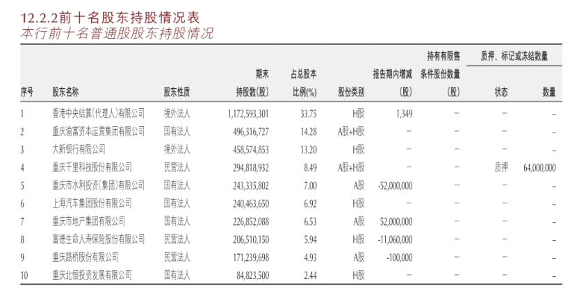 也就是说,重庆银行的前十大股东中,原第九大股东重庆路桥(持股比例4.93%),被持股4.99%的重庆高速取代了。据2025年年报,重庆渝富资本运营集团及其一致行动人合并持有该行股份7.59亿股,占该行总股份的21.84%,为该行第一大股东。