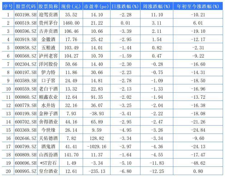 数据显示,本周20家白酒A股,其中收涨6家,收平0家,收跌14家。