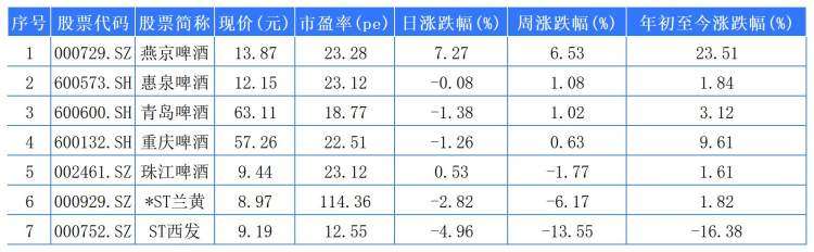 本周,啤酒A股4家上涨,燕京啤酒以6.53%领涨,而会稽山以9.15%领涨黄酒股。