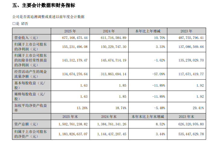 数据显示 , 公司2025年实现营业收入6.77亿元 , 同比上升10.70% ; 归母净利润1.55亿元 , 同比增长3.33% ; 扣非净利润1.43亿元 , 同比下降1.62% 。
