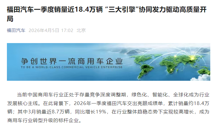 福田汽车:一季度销量近18.4万辆