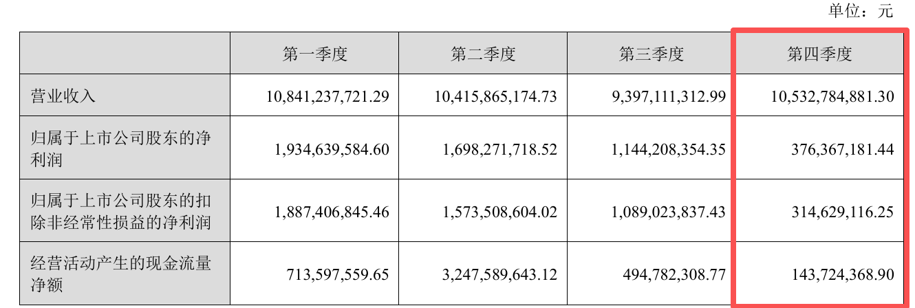 单季度来看,公司第四季度营业收入为105.33亿元,同比上升4%;归母净利润为3.76亿元,同比下降11%,环比下降67%;扣非净利润为3.15亿元,同比上升22%。