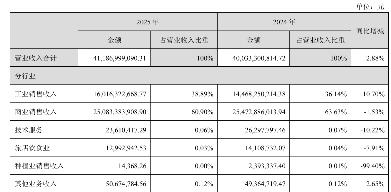 分行业来看,2025年,公司收入结构呈现“一增多降”的分化格局。公司工业销售收入逆势增长10.70%至160.16亿元,占比38.89%,成为唯一亮点;而占据营收六成以上的云南白药商业板块却显疲态,收入250.83亿元,同比微降1.53%,基本盘承压。
