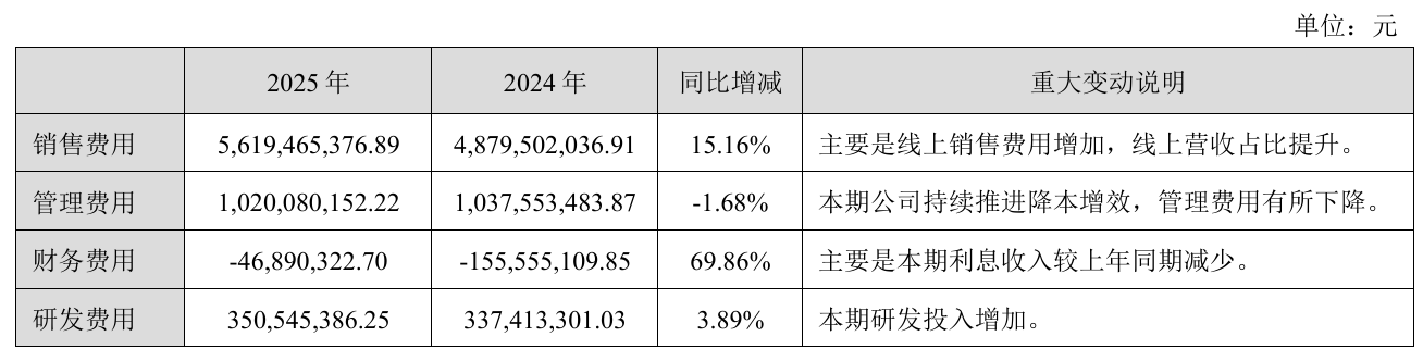 销售费用同比大涨15.16%至56.19亿元,线上渠道扩张持续推高营销开支;而研发费用仅约3.51亿元,同比微增3.89%,尚不足销售费用的零头,两者差距逾16倍。