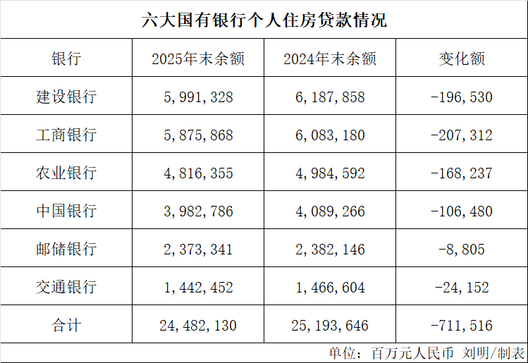 【导读】六大国有银行披露,2025年个人住房贷款余额合计减少超7000亿元