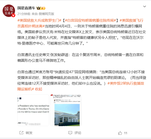 白宫回应特朗普病重住院传闻