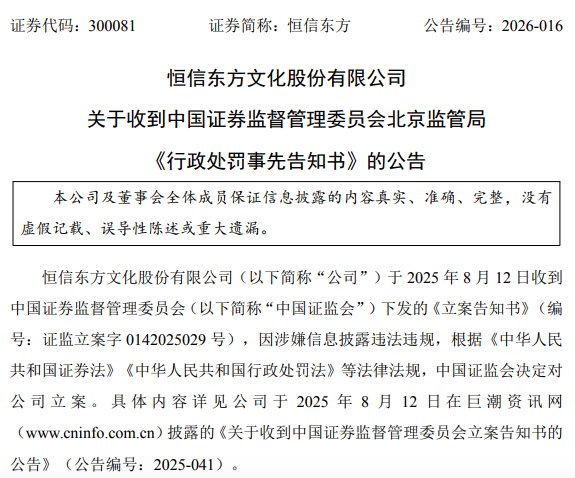 恒信东方(300081.SZ)4月3日晚间发布公告称,因2022年年度报告存在虚假记载、虚增营收1.82亿元,公司及相关当事人当日收到《行政处罚事先告知书》,北京证监局拟决定对公司及4名时任高管合计1250万元罚款。
