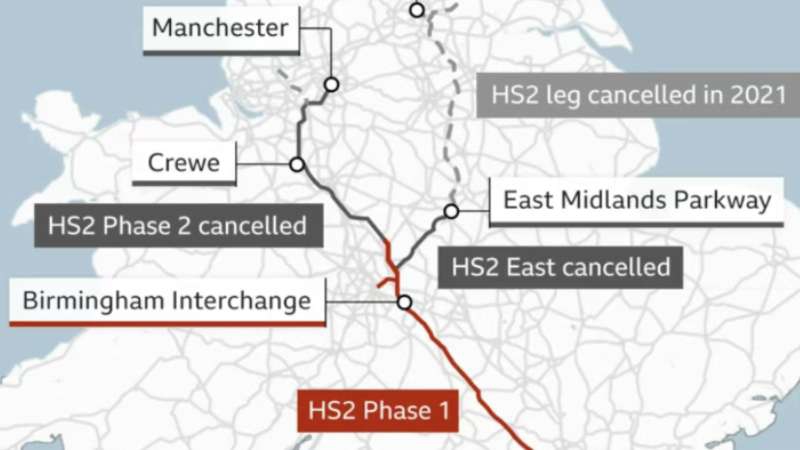 如果说降速只是一个信号,那么真正让HS2陷入争议的,是它一路失控的成本。该项目自2009年提出时预算为375亿英镑,至2019年已增至446亿英镑。最新估算显示,最终成本或逼近甚至超过千亿美元。更令人担忧的是,在巨额投入后项目规划却持续缩水。原计划连接曼彻斯特、利兹等北部城市的线路已被取消,目前仅剩伦敦至伯明翰段推进中。