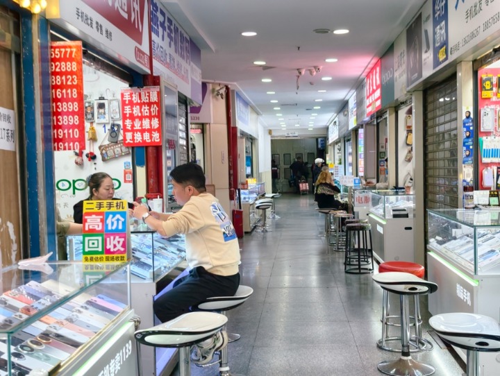 在二手手机交易市场,大部分商家表示,回收后可以继续使用的手机会经过检测和维修再次进入市场,而非拆下零部件(本文照片除截屏外,均作者拍摄)
