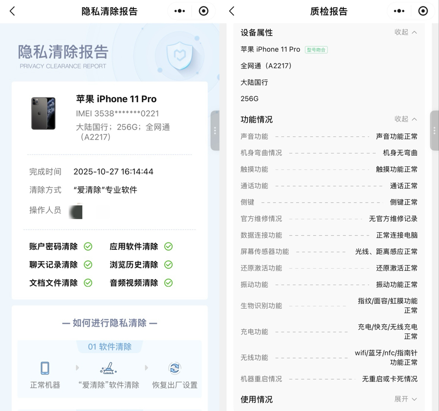 记者曾将旧手机通过回收平台回收,收到了旧手机的隐私清除和质检报告