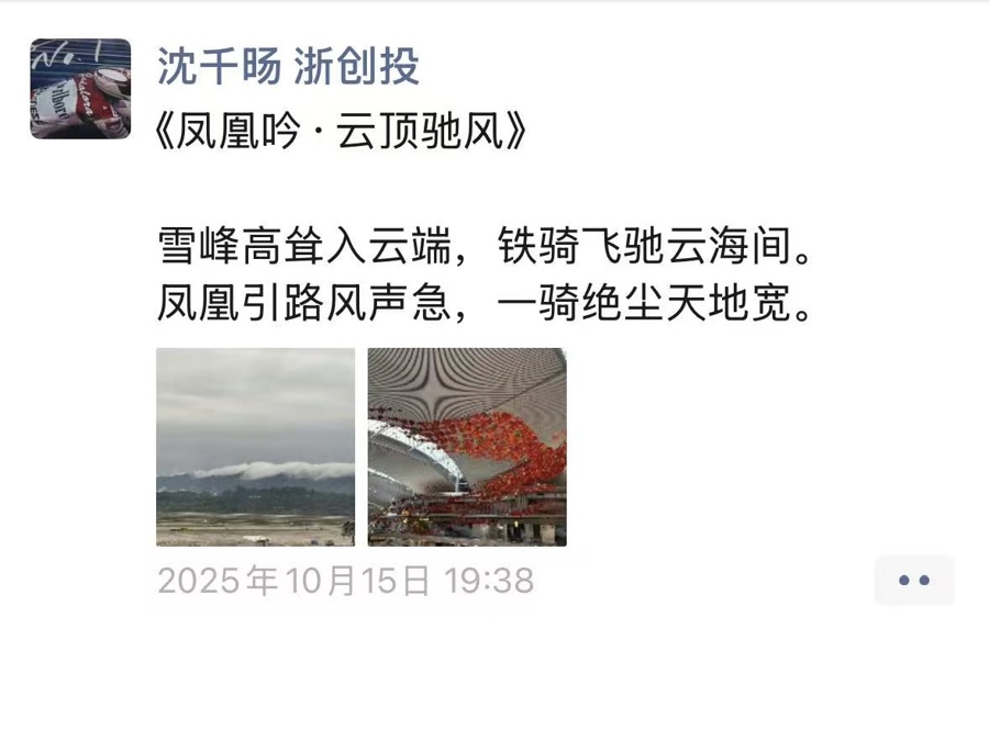2025年10月,在曹斌的牵线搭桥下,沈千旸第一次去重庆与张雪见面。在江北机场,看着天空中飘过的云朵,年轻的“摩托佬”觉得酷似飞驰的摩托车,当场诗兴大发,写就了一首题为《凤凰吟·云顶驰风》的古体诗:雪峰高耸入云端,铁骑飞驰云海间。凤凰引路风声急,一骑绝尘天地宽。