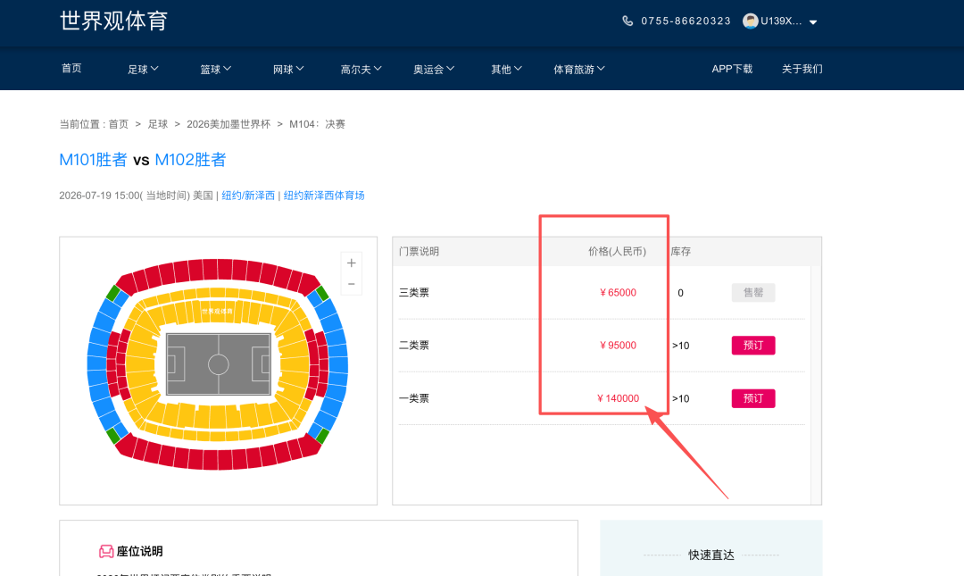 在一家名为“世界观体育”的票务网站上,记者看到了较为完整的赛事选购流程。从小组赛到半决赛、决赛,各阶段比赛均可购买,票价从2000元到140000元不等,比赛热度越高,票价随之水涨船高。