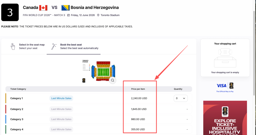 例如当地时间6月12日的小组赛加拿大对阵波黑,最低票价355美元,折合人民币1755元,最高票价2240美元,折合人民币15417元。