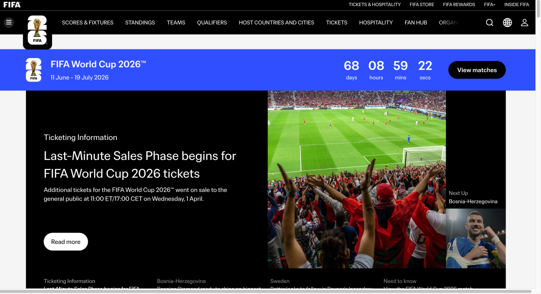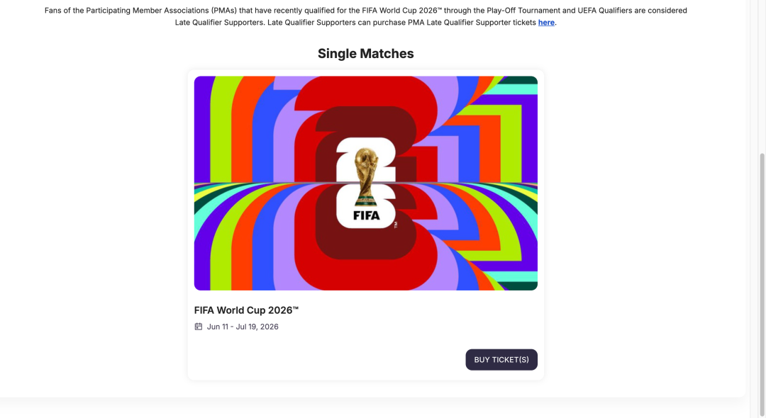蓝鲸记者实测发现,目前FIFA官网已开启购票渠道,用户注册完账号后可在网站内选择相应的比赛。