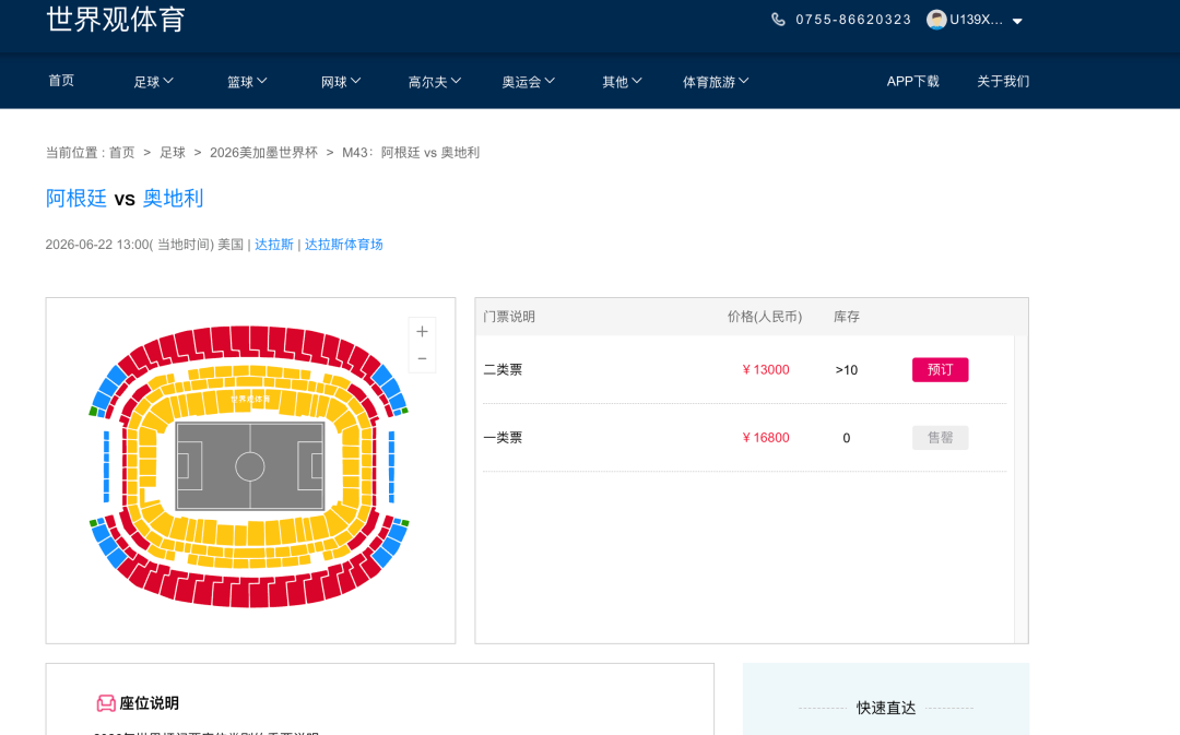 以当地时间6月22日的小组赛阿根廷对阵奥地利为例,一类票价高达16800元,且已显示售罄,二类票价也达到了13000元。