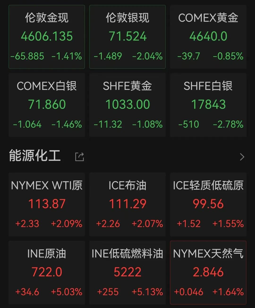 贵金属市场方面,黄金、白银价格回调。截至北京时间7:43,伦敦金现跌1.41%,报4606.135美元/盎司,COMEX黄金期货跌0.85%,报4640美元/盎司;伦敦银现跌2.04%,报71.524美元/盎司,COMEX白银期货跌1.46%,报71.86美元/盎司。