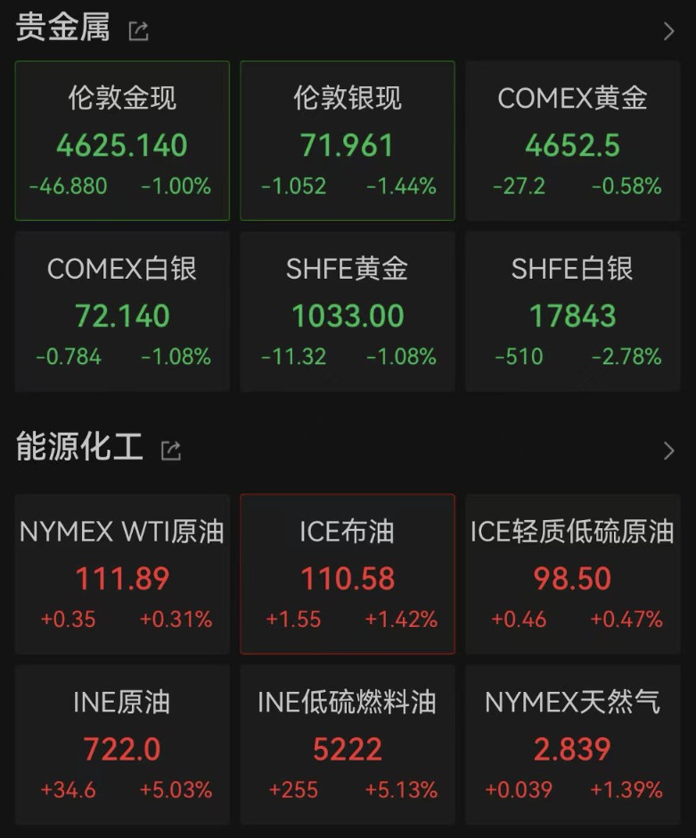 商品市场方面,Wind数据显示,截至北京时间9:49,伦敦现货黄金下跌1%,报4625.140美元/盎司;伦敦现货白银下跌1.44%,报71.961美元/盎司。