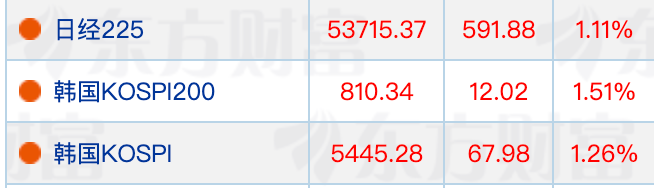 股市方面,日韩股市普涨,日经225指数、韩国KOSPI指数涨幅均超过1%。
