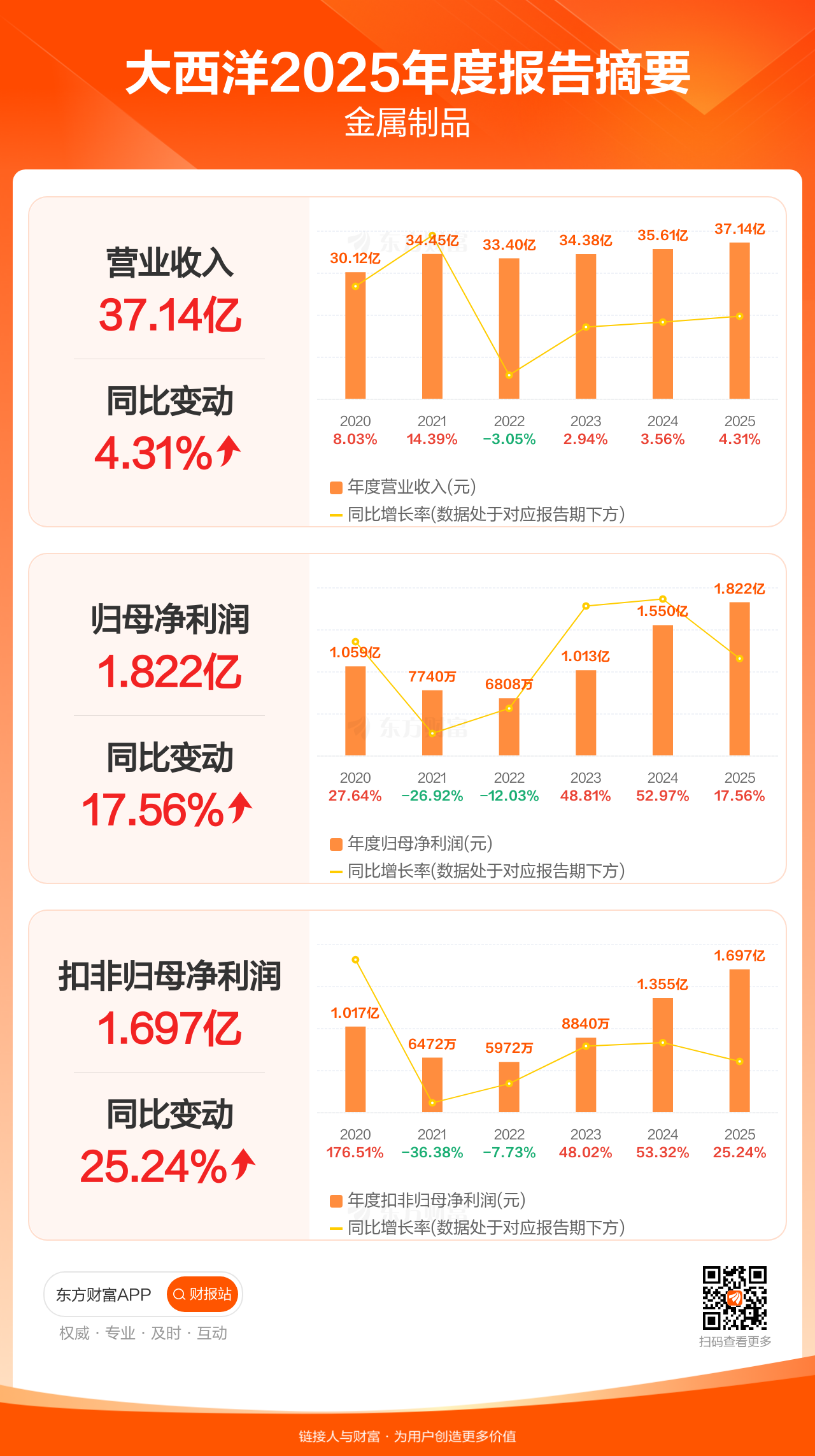 大西洋4月7日发布2025年年报显示,公司全年实现营业收入37.14亿元,同比增长4.31%;归母净利润1.82亿元,同比增长17.56%;扣非归母净利润1.70亿元,同比增长25.24%。