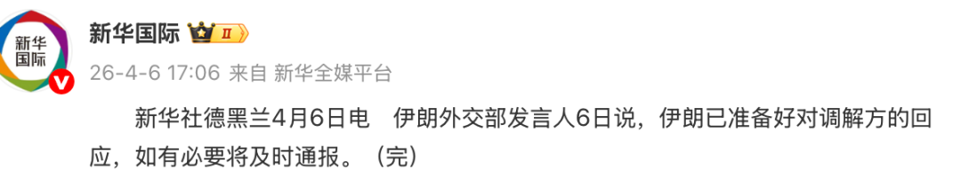 新华社德黑兰4月6日电伊朗外交部发言人4月6日说,伊朗已准备好对调解方的回应,如有必要将及时通报。
