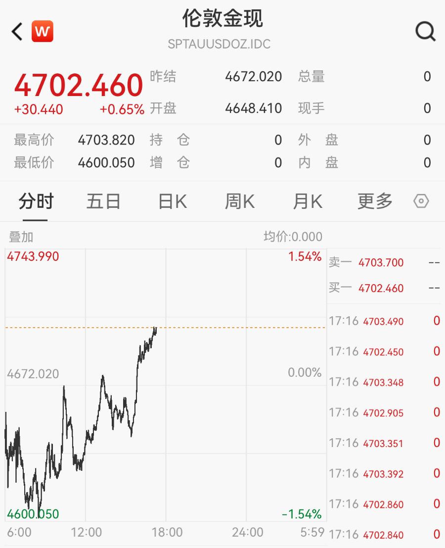 北京时间4月6日,现货黄金震荡拉升翻红,一度站上4700美元大关。