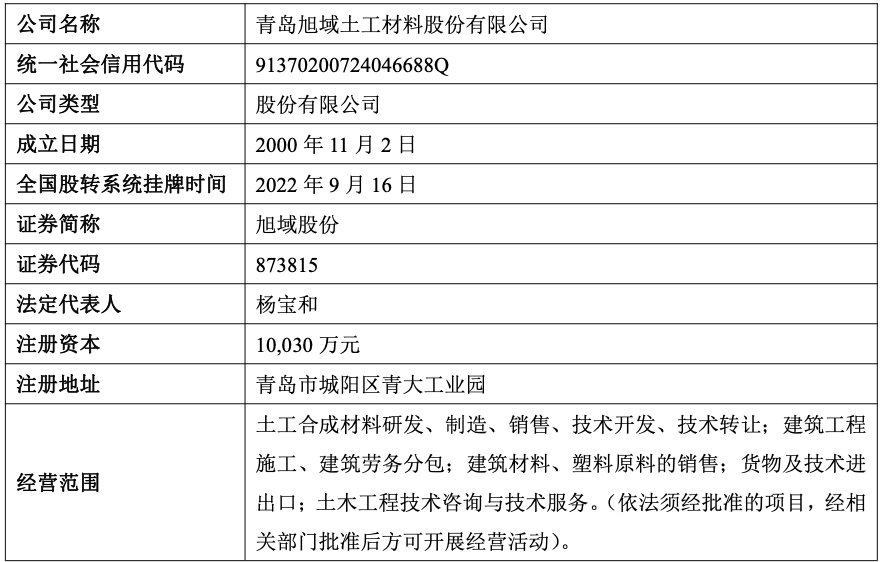 本次交易的标的公司为全国中小企业股份转让系统挂牌公司青岛旭域土工材料股份有限公司(证券简称:旭域股份,证券代码:873815),该公司成立于2000年11月2日。