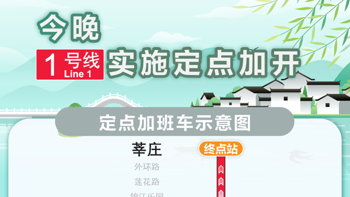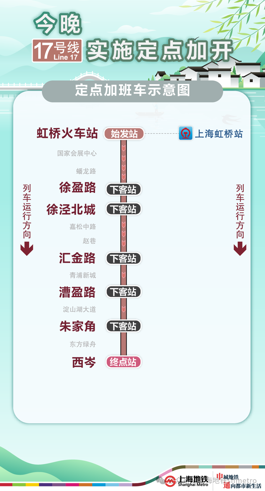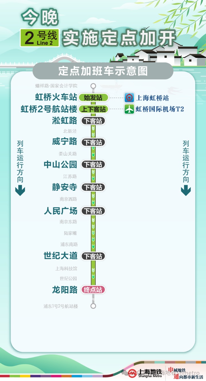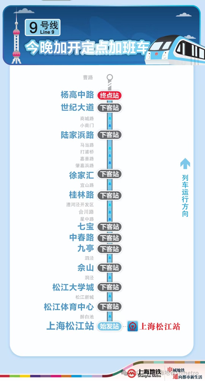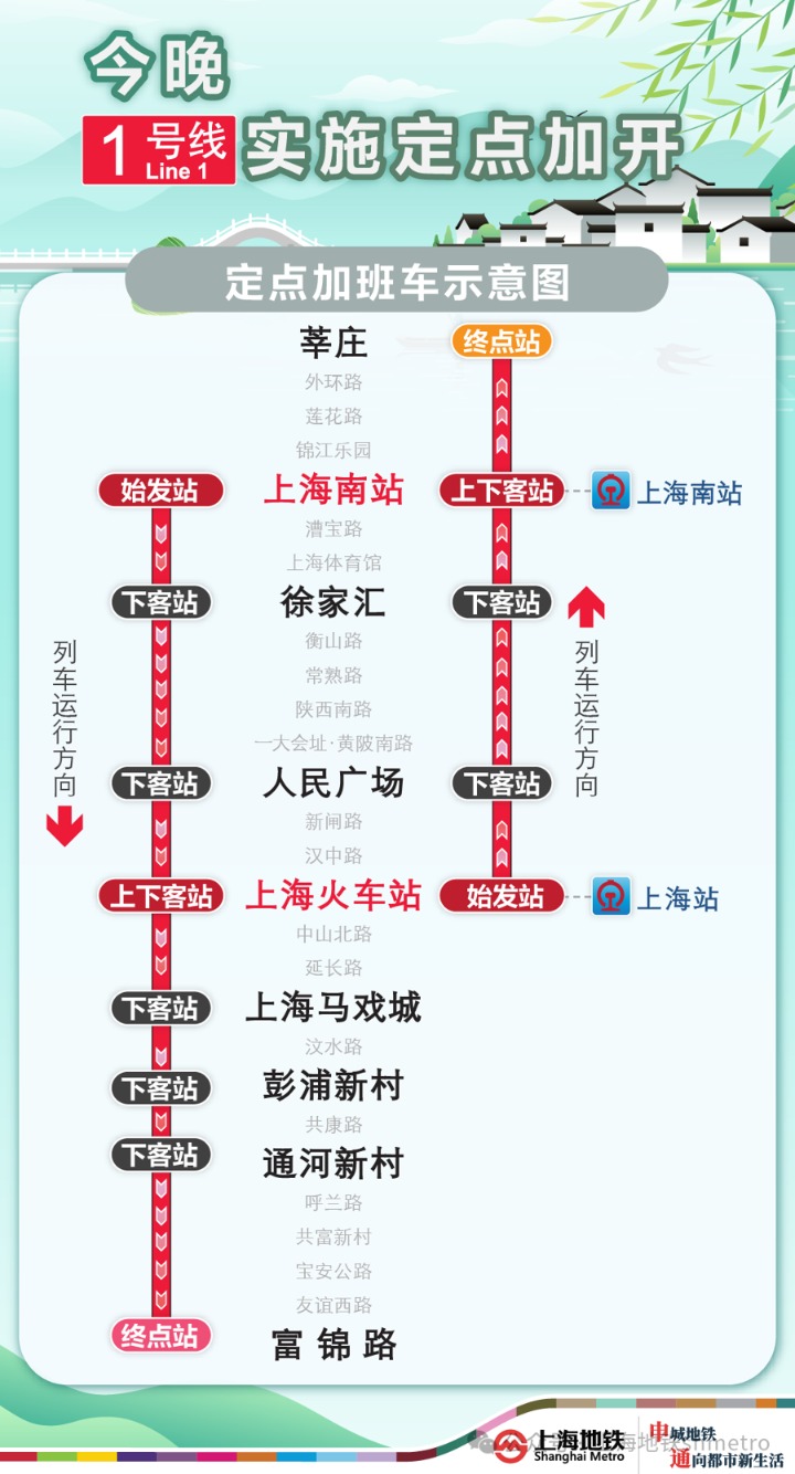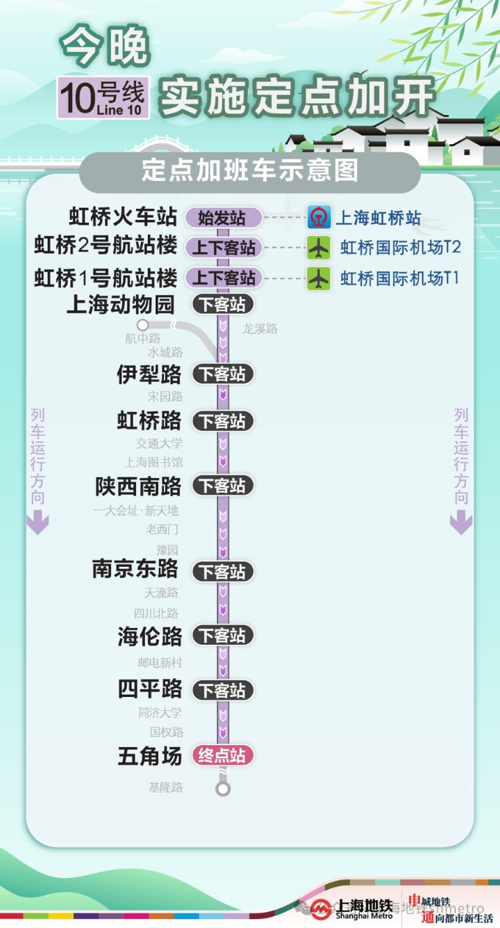 为满足清明返程期间乘客夜间出行需求,今晚(4月6日),1号线加开定点加班车,上海南站站往富锦路站加开至次日(4月7日)0时,上海火车站站往莘庄站加开至次日(4月7日)0时;2号线加开定点加班车,虹桥火车站站往龙阳路站加开至次日(4月7日)0时45分;9号线加开定点加班车,上海松江站站往杨高中路站加开至23时45分;10号线加开定点加班车,虹桥火车站站往五角场站加开至次日(4月7日)0时;17号线加开定点加班车,虹桥火车站站往西岑站加开至次日(4月7日)0时。