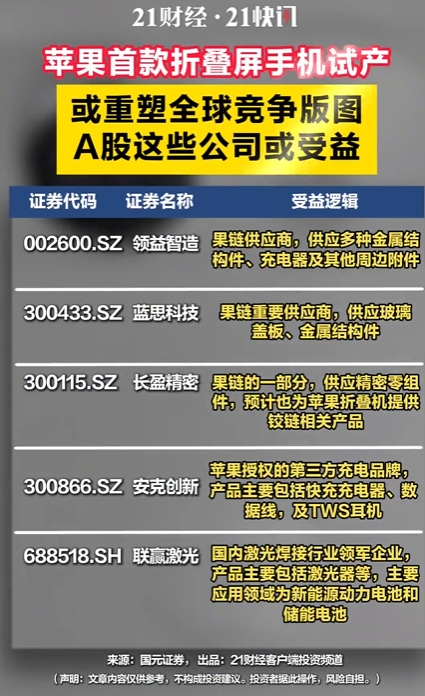苹果首款折叠屏手机试产 A股这些公司或受益