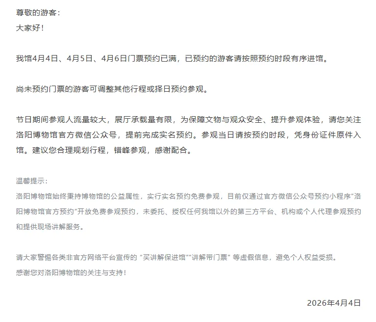 河南洛阳博物馆、白马寺景区等发文提醒,4月5日—6日门票预约已满。老君山景区发布公告称,4月5日预约售票数量已达上限。