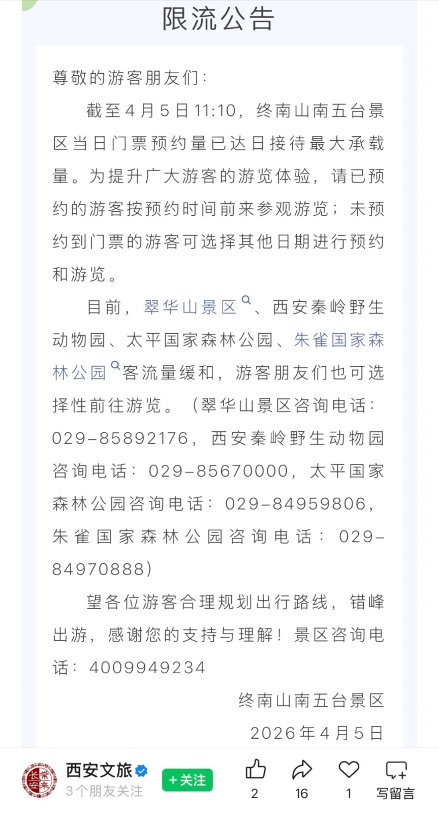 陕西西安终南山南五台景区发布限流公告,截至4月5日11:10,终南山南五台景区当日门票预约量已达日接待最大承载量。为提升广大游客的游览体验,请已预约的游客按预约时间前来参观游览;未预约到门票的游客可选择其他日期进行预约和游览。翠华山景区、西安秦岭野生动物园、太平国家森林公园、朱雀国家森林公园客流量缓和,游客朋友们也可选择性前往游览。