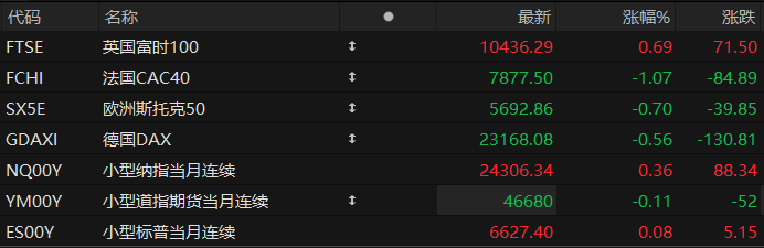 周一盘前,美股三大股指期货涨跌不一,欧洲主要指数多数下跌。截至发稿,纳斯达克100指数期货涨0.36%,道指期货跌0.11%,标普500指数期货涨0.08%。