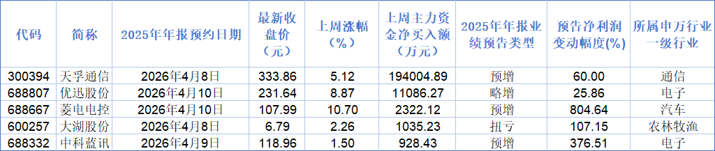 市场表现方面,上述60只预喜股中,15只预喜股上周股价实现上涨。菱电电控上周累计涨幅居首,达到10.70%,优迅股份、天孚通信上周累计涨幅也均超5%。