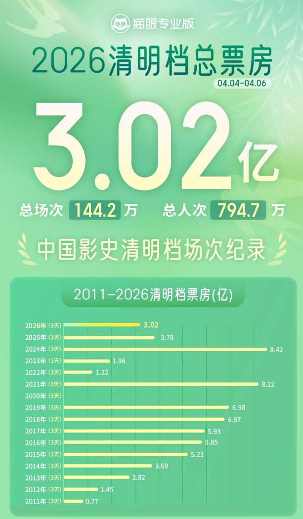 上证报中国证券网讯(记者杨翔菲)据猫眼专业版数据,截至4月6日21时,2026年清明档票房达3.02亿元,观影总人次794.7万。档期总场次达144.2万,刷新中国影史清明档场次纪录。