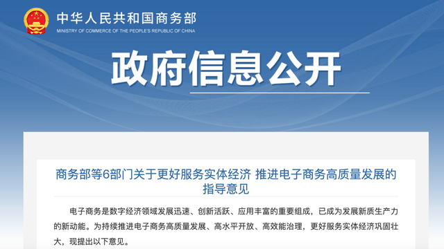4月6日,商务部、中央网信办、工业和信息化部、农业农村部、文化和旅游部、市场监管总局等6部门发布《商务部等6部门关于更好服务实体经济推进电子商务高质量发展的指导意见》。