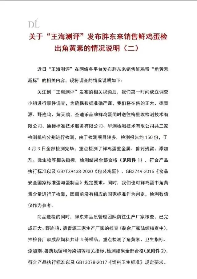 说明称,在关注到“王海测评”相关视频后,已第一时间成立调查小组。为确保严谨,他们将在售的多个品牌鲜鸡蛋送往三家权威检测机构进行检测,约150份检测报告显示,所有样品的重金属、兽药残留、添加剂、微生物等指标均合格,符合国家相关标准。同时,对鲜鸡蛋中角黄素的检测数值,因无国家标准,仅作为参考。