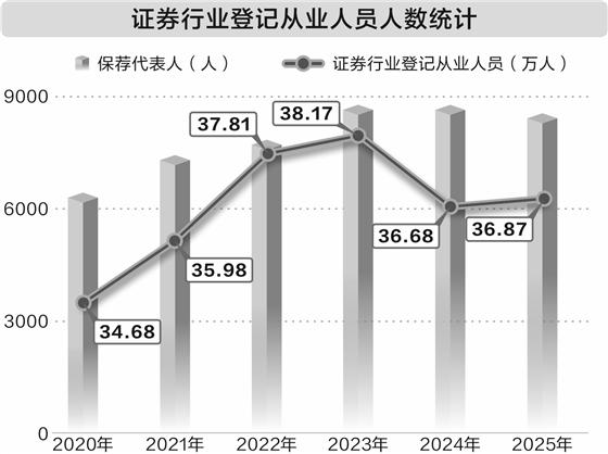 中国证券业协会数据显示,截至2025年12月底,证券行业登记从业人员数量为36.87万人,其中保荐代表人为8526人。而据Wind数据,这一数字在2024年底为8799人,相当于一年流失了273人。