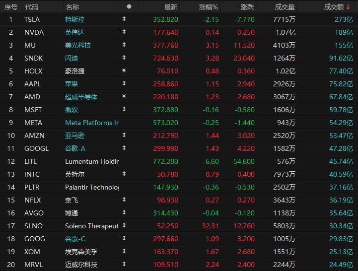 第2名英伟达收高0.14%,成交189亿美元。在人工智能芯片需求持续强劲的背景下,英伟达的关键产能保障依然稳固,但新一代GPU产品推进节奏或受到内存技术瓶颈的影响。