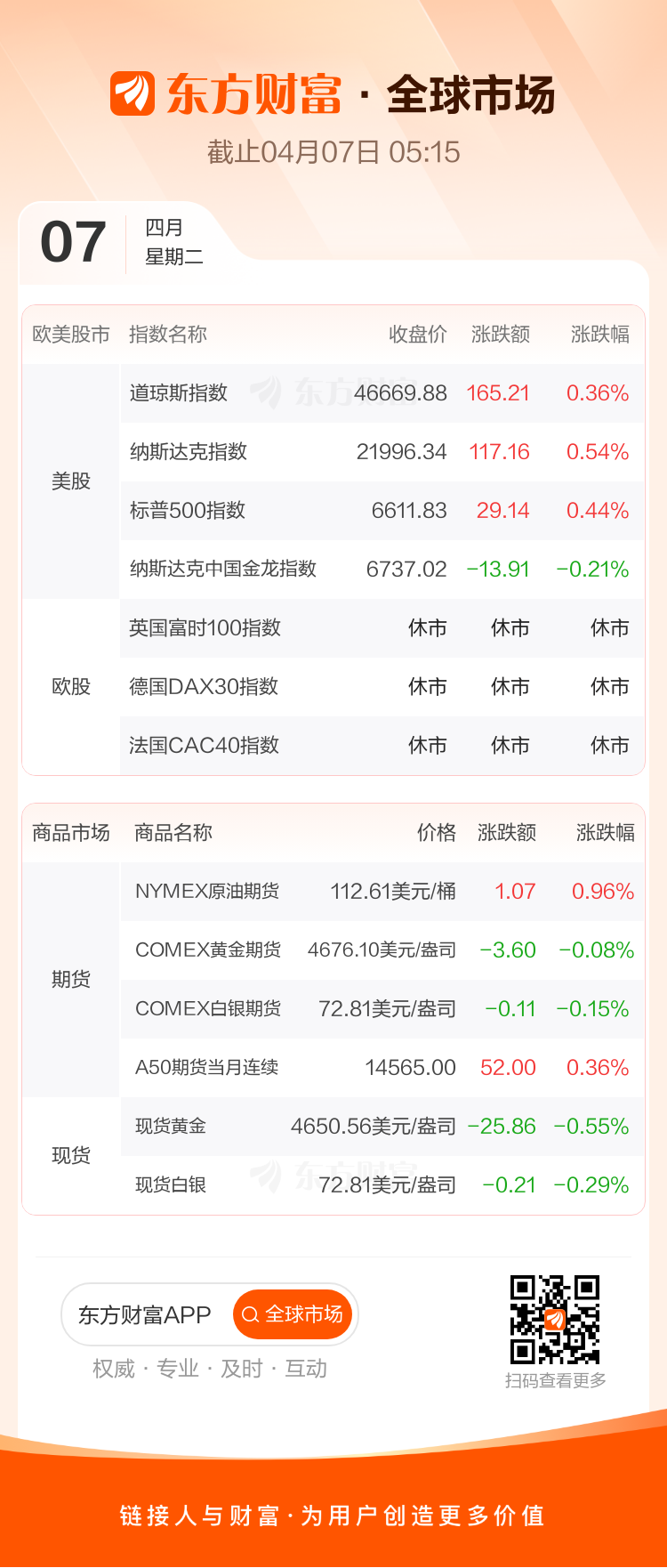 国际油价:国际油价04月06日上涨。截至当天收盘,纽约商品交易所WTI原油期货当月连续合约上涨1.07美元,收于每桶112.61美元,涨幅为0.96%。