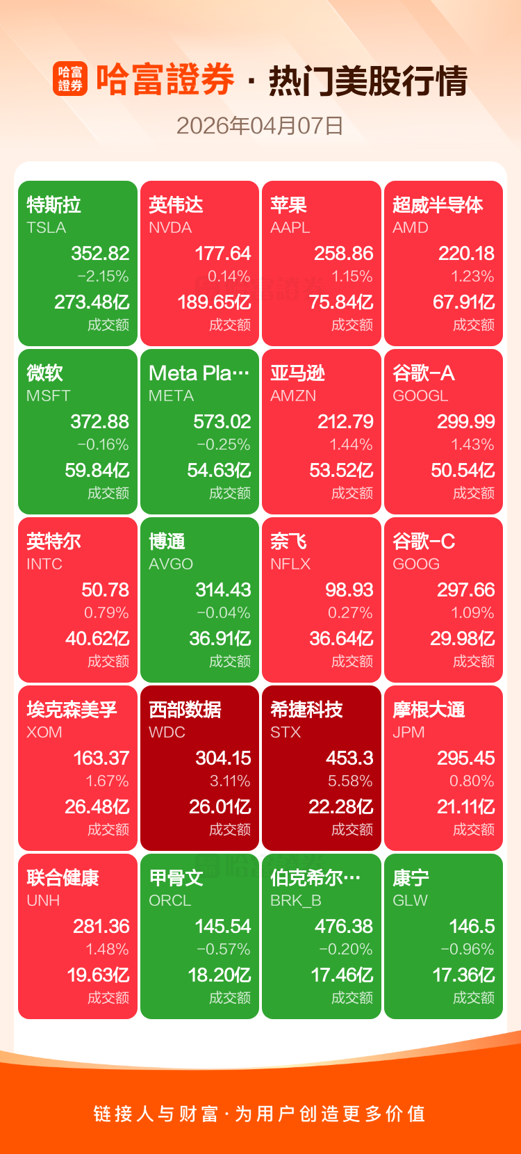 特斯拉跌2.15%,英伟达涨0.14%,苹果涨1.15%,超威半导体涨1.23%,微软跌0.16%,Meta Platforms Inc-A跌0.25%,亚马逊涨1.44%,谷歌-A涨1.43%,英特尔涨0.79%,博通跌0.04%。