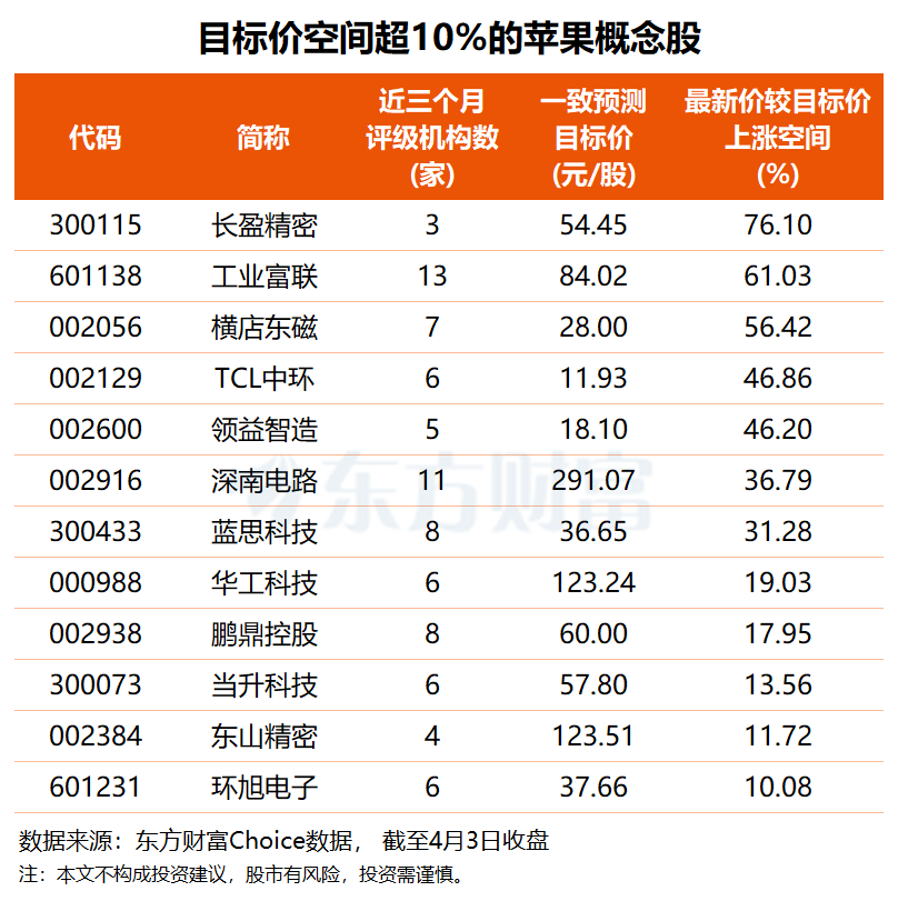机构关注度方面,东方财富Choice数据显示,近三个月共有14只苹果概念股获得3家及以上机构给予投资评级,以一致预测目标价与最新收盘价相比,共有7股上涨空间超30%。