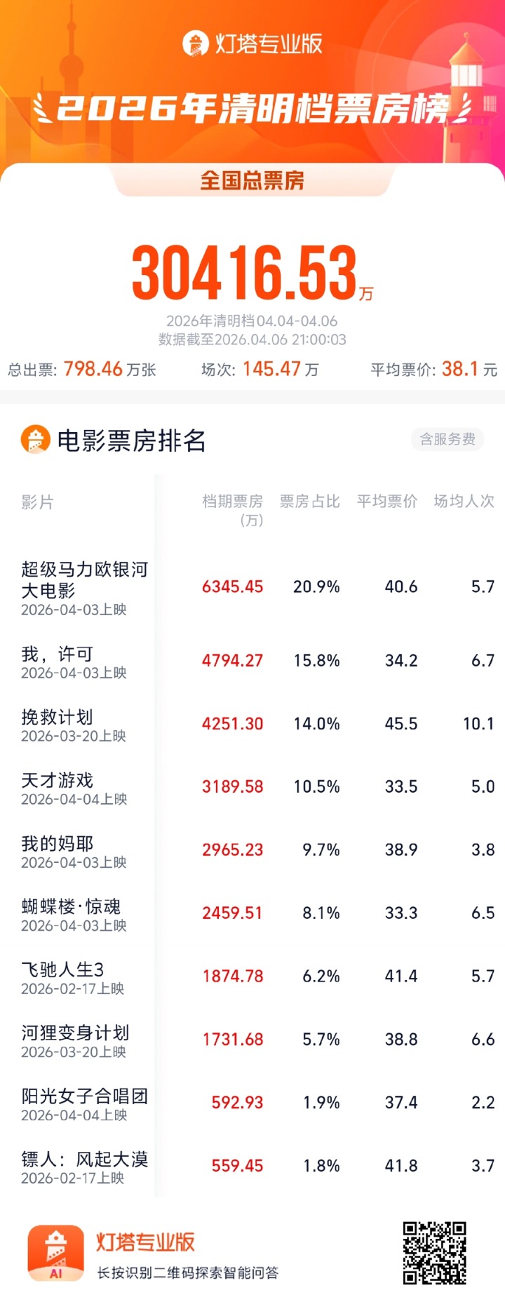 据灯塔专业版统计,截至4月6日21时,2026年清明档(4月4日-6日)票房3.04亿元,影片《超级马力欧银河大电影》成为清明档票房冠军。