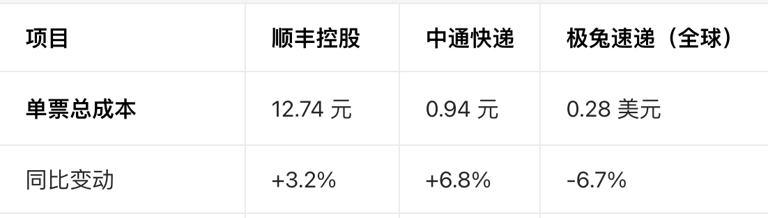 对比其他物流企业,这是一个不错的成绩。同期,顺丰控股及中通快递单票成本均有不同程度增加。根据财报,顺丰控股同期单票成本约12.74元,同比增加3.2%;中通快递同期单票成本约为0.94元,同比增加6.8%。