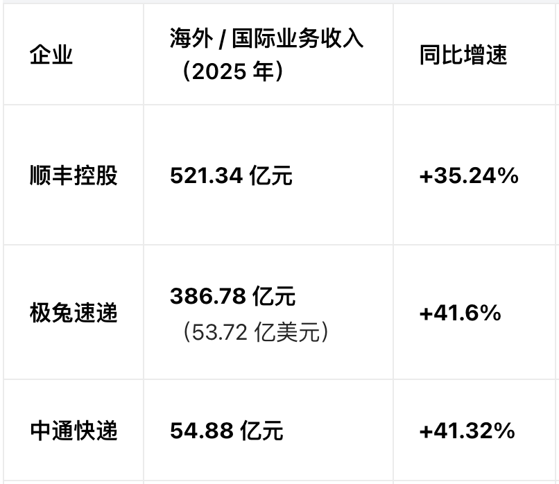 事实上,“掘金海外”是整个行业都在努力的方向。2025年度,顺丰、极兔、中通三家物流企业在海外市场的收入同比增速均远高于国内市场,录得高位增长。