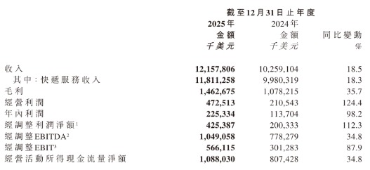 近日,极兔速递(01519.HK)发布2025年财报。财报显示,2025年极兔全球包裹总量突破300亿件,同比增长22.2%;全年总收入达到121.6亿美元,同比增长18.5%;年内利润达到2.25亿美元,同比增幅达98.2%;经调整净利润为4.25亿美元,同比大增112.3%。