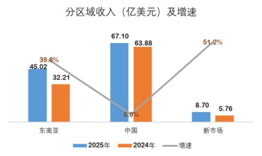2025年度,极兔在中国地区收入67亿美元,同比增长约5%;在东南亚地区收入45亿美元,同比增长39.8%;在新市场收入8.7亿美元,同比增长51.3%,首度实现全年盈利。